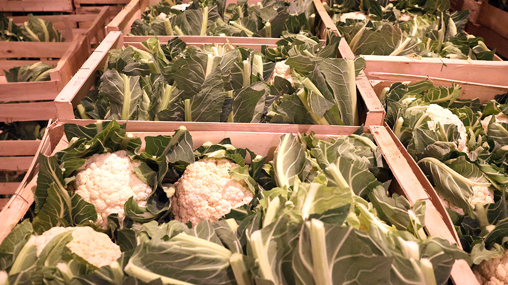 Diverses variétés de choux, courgette, Butternut, maïs, céréales, blé et orge.